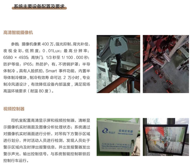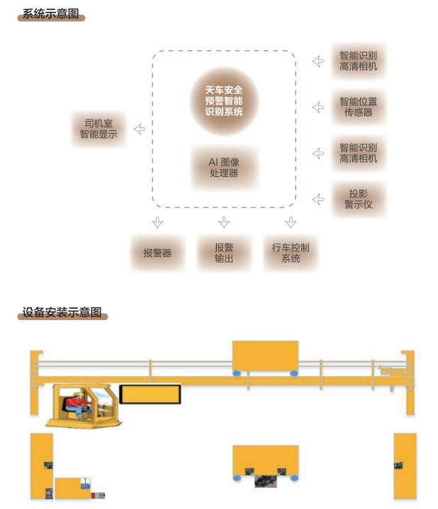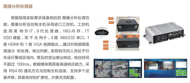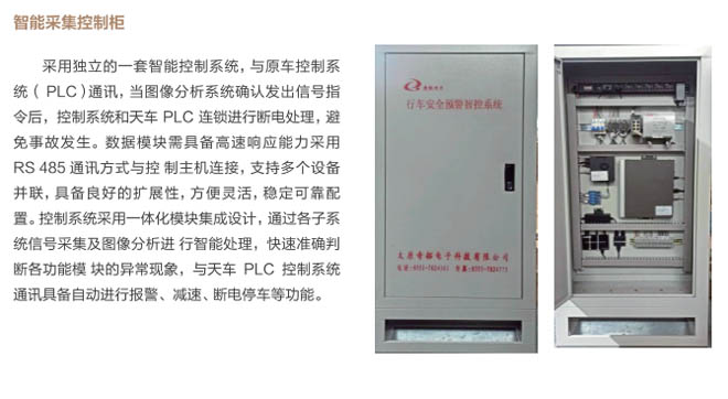 6、行車智控系統(tǒng):控制系統(tǒng)采用一體化模塊集成設(shè)計(jì), 通過(guò)各子系統(tǒng)信號(hào)采集及圖像分析進(jìn) 行智能處理,快速準(zhǔn)確判斷各功能模 塊的異常現(xiàn)象,與主機(jī)PLC控制系統(tǒng) 通訊連接具備自動(dòng)進(jìn)行報(bào)警、減速、斷電停車等功能,當(dāng)系統(tǒng)確認(rèn)發(fā)出信號(hào)指令后,控制系統(tǒng)和行車PLC連鎖進(jìn)行斷電處理,避免事故發(fā)生。
